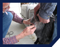 4. The doe’s head should be turned opposite to the side of collection, once again at a 30-degree angle. Restraint of the head is accomplished by using the elbow and the upper arm to keep it held off to the side. This leaves both hands available for the blood collection. An unruly doe can be dangerous to the assistants, the person drawing the blood, and to itself. It is important to be gentle and patient when restraining the doe.